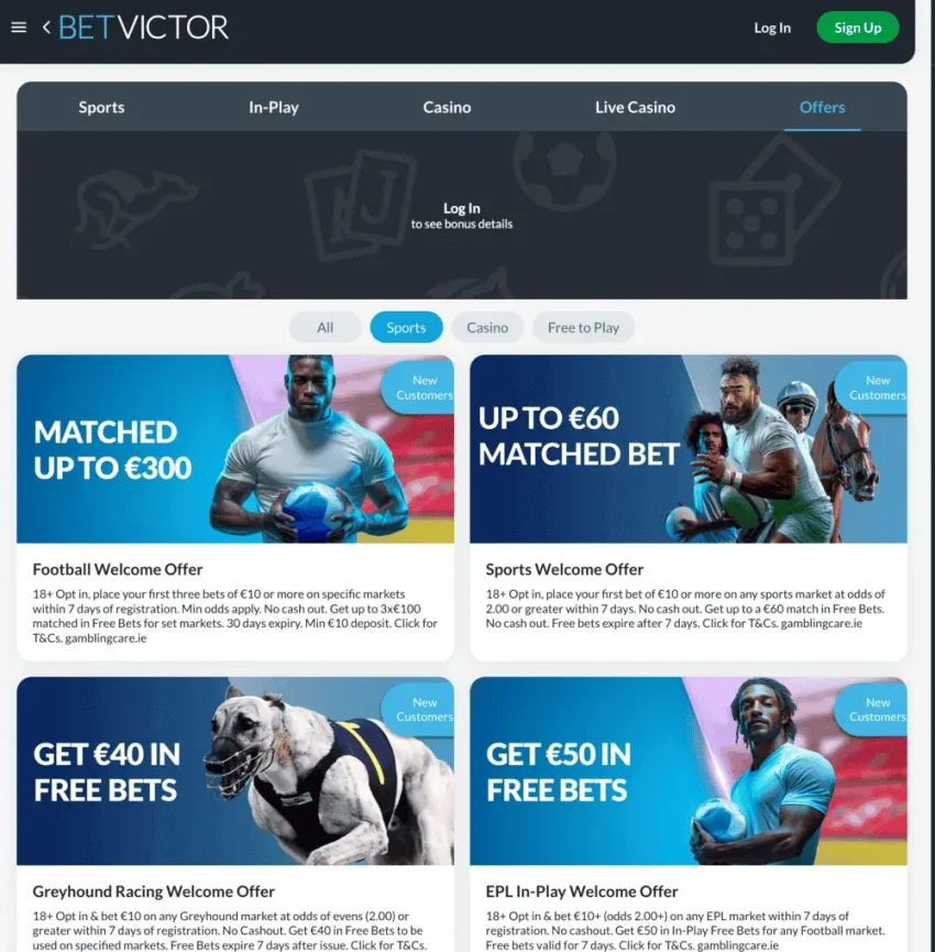 BetVictor is probably the most generous of any bookmaker we recommend, thanks to their extension welcome bonus selection for sports fans. These included; matched up to €300 on football, up to €60 matched on sports, €40 in free bets on greyhound racing, €50 in free bets on EPL, €60 match bed on horse racing, plus many more promotions including their win up to €50k on BetVictor Predictor.