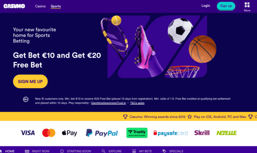 Casumo are a brand that many casino fans know, but alongside their excellent casino game selection, they also offer an excellent sportsbook in Ireland. New customers can claim a great bet €10 get €20 offer, which may not be the most generous, but this combined with their great range of payment methods (including PayPal) make them a worthy addition to our list of best bookmakers.